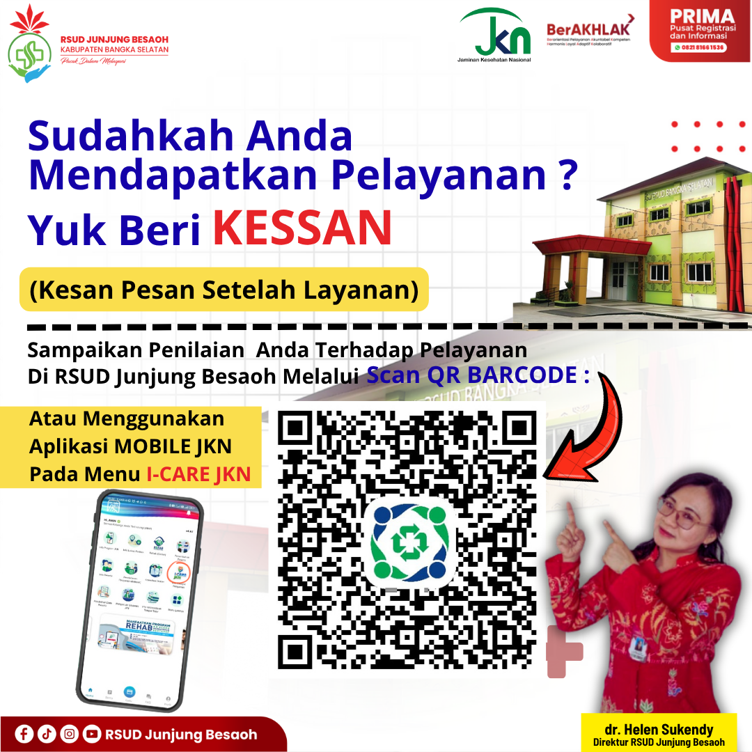 Hallo Sobat RSUD JUnjung Besaoh Yuk Beri KESSAN (Kesan Pesan Setelah Layanan) Melalui QR Barcode di bawah ini.... Jangan lupa ya Sobat ! ???????? #bangkaselatan #RSUDjunjungbesaoh @jknbabel