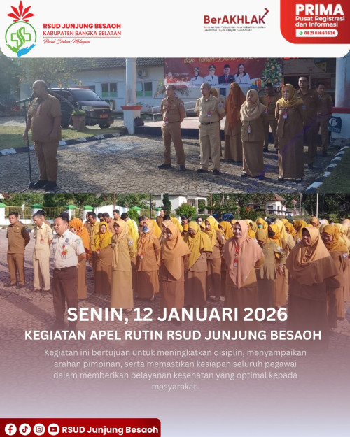 Toboali, 12 Januari 2026 - Kegiatan apel rutin RSUD Junjung Besaoh diikuti oleh 72 peserta dengan Pembina apel yaitu Ns.Doni Candra, S.Kep selaku Kepala Instalasi Rawat Inap RSUD Junjung