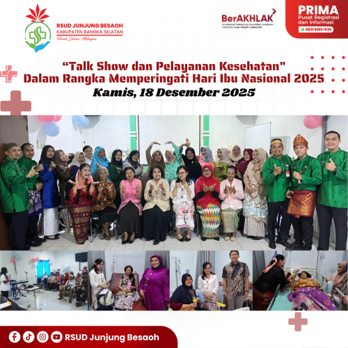 RSUD Junjung Besaoh Merayakan Hari Ibu Nasional 2025 dengan Kegiatan Kolaborasi LANSIA BERSERI RSUD Junjung Besaoh, 22 Desember 2025 - Dalam rangka memperingati Hari Ibu Nasional, RSUD Junjung Besaoh berkolaborasi dengan LANSIA BERSERI mengadakan kegiatan yang bertujuan untuk meningkatkan kesehatan dan kesejahteraan ibu-ibu, terutama lansia. Kegiatan ini meliputi talkshow tentang penanganan