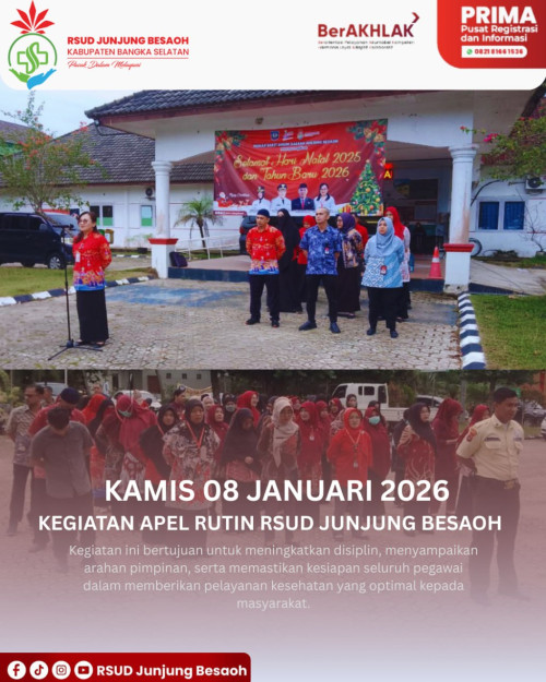 Toboali, 08 Januari 2025 - Kegiatan apel diikuti oleh 65 peserta. Pembina pada apel hari ini adalah dr. Helen Sukendy selaku Direktur RSUD Junjung Besaoh. Kegiatan apel rutin RSUD Junjung Besaoh dilaksanakan sebagai upaya meningkatkan disiplin, menyampaikan arahan pimpinan, serta memastikan kesiapan seluruh pegawai dalam memberikan pelayanan kesehatan terbaik bagi masyarakat Bangka